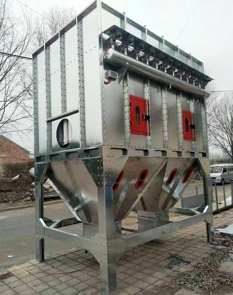 含塵氣體在風機的吸力下通過管道進入布袋除塵器過濾室,較粗顆粒直接落入灰斗或灰倉,含塵氣體經濾袋過濾,粉塵阻留于袋表,凈氣經袋口到凈氣室,由風機排入大氣。當濾袋表面的粉塵不斷增加,導致設備阻力上升到設定值時,時間繼電器(或微差壓控制器)輸出信號,程控儀開始工作,逐個開啟脈沖閥,使壓縮空氣通過噴口對濾袋進行噴吹清灰,使濾袋突然膨脹,在反向氣流的作用下,附于袋表的粉塵迅速脫離濾袋落入灰斗(或灰倉),粉塵由卸灰閥手動或自動排出。