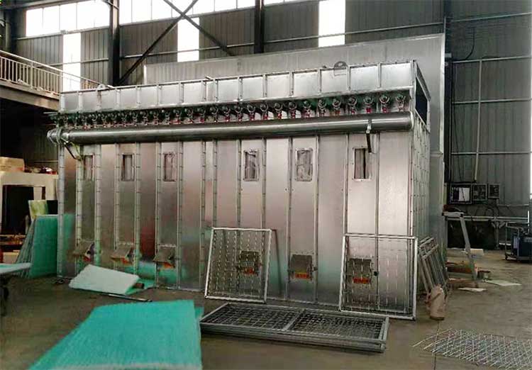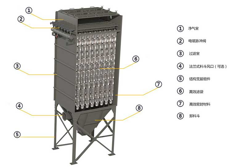 布袋除塵器主要由灰斗、過濾室、凈氣室、支架、提升閥、噴吹清灰裝置等部分組成。工作時,含塵氣體由風道進入灰斗。大顆粒的粉塵直接落入灰斗底部,較小的粉塵隨氣流轉折向上進入過濾室,并被阻留在濾袋外表面,凈化了的煙氣進入袋內,并經袋口和凈氣室進入出風倒,由排風口排出。隨著過濾的不斷進行,濾袋外表面的粉塵不斷增加,設備阻力隨之上升。當設備阻力上升到一定值時,應進行清灰操作,清除濾袋表面的積灰。