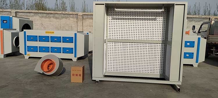 噴漆時所產生的漆霧顆粒,在風機的吸力下,漆霧顆粒首先通過一級過濾(漆霧過濾棉、V型過濾紙、迷宮紙盒),大部分漆霧顆粒被截留在吸附介質上面,剩下部分細小顆粒經過纖維過濾棉進行二次過濾,經過二級過濾后,漆霧凈化效果達90%以上,處理后的廢氣通過廢氣處理設備(活性炭吸附箱、光氧催化、催化燃燒裝置)凈化后達到高空排放標準。