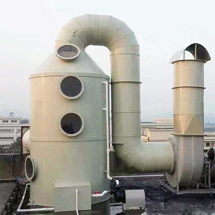 廢氣凈化塔利用氣體與液體間的接觸,而將氣體中的污染物傳送到液體中,然后再將清潔氣體與被污染的液體分離,達(dá)到清凈空氣的目的。廢氣經(jīng)由廢氣凈化塔,采用氣液逆向吸收方式處理,即液體自塔頂向下以霧狀(或小液滴)噴撒而下。廢氣則由塔體(逆向流)達(dá)到氣液接觸之目的。此處理方可冷卻廢氣、調(diào)理氣體及去除顆粒,再經(jīng)過(guò)除霧段處理后,排入大氣中。