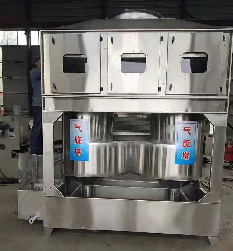 氣旋混動噴淋塔設備作業時,漆霧在負壓風機牽引力的作用下進入高速旋流導軌裝置,漆霧、旋風與水在高速旋轉的進行氣液乳化反應。氣動混流裝置的高速運轉,使得漆霧與旋轉液體充分混合,在離心力的作用下達到氣液分離。氣旋筒內部采用水泵循環給水,由安裝在隔水層底部的螺旋噴嘴噴出來,漆霧分離出來的粉塵顆粒物下沉到水箱底部,分離后的氣體進入環保填料隔水層,然后進入后段的廢氣處理設備,由此經過氣旋混動噴淋塔處理漆霧或顆粒物的凈化率可達95%以上。