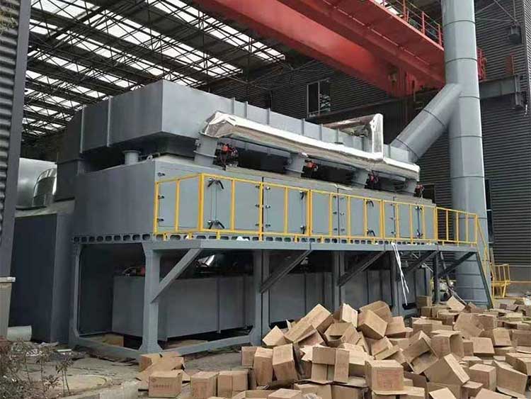 4、催化燃燒設備,經過前處理的噴漆房廢氣,漆霧顆粒與其他粘性物質已經得到凈化,此時只需要處理噴漆所產生的有機廢氣,使噴漆所生產的甲苯,二甲苯等有機廢氣得以凈化。生產中產生的有機廢氣使用移動伸縮噴漆房收集,需要的風量量為5萬風量,廢氣的特點是風量大,廢氣含量少,所以需要使用活性炭吸附脫附催化燃燒設備來處理有機廢氣。