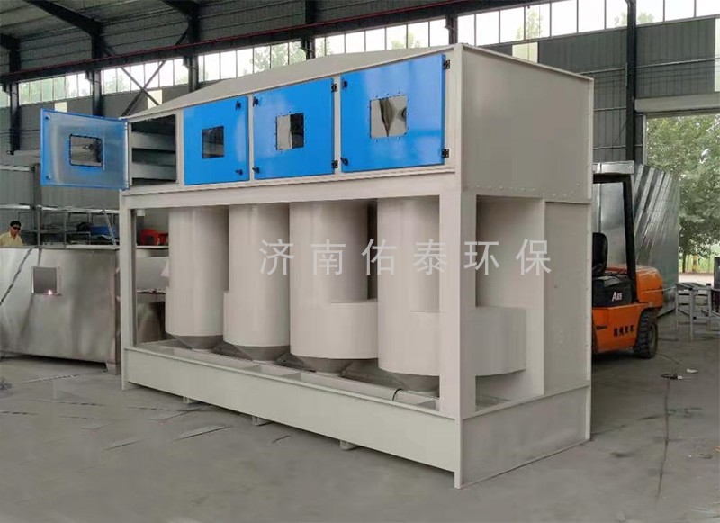 2、氣旋噴漆柜,移動伸縮房固定端設置一臺6米長氣旋噴漆柜,噴漆產生的漆霧顆粒,在風機的遷引下,一部分漆霧顆粒吸附在水簾上面并落入水池中。絕大部分漆霧顆粒經過氣旋裝置及漆霧分離裝置的碰撞,***后也落入水池之中。漆霧去除率達到95%以上。從頁排出不含漆霧顆粒的有機廢氣。為后續催化燃燒設備的正常運行,提供良好的預處理條件。