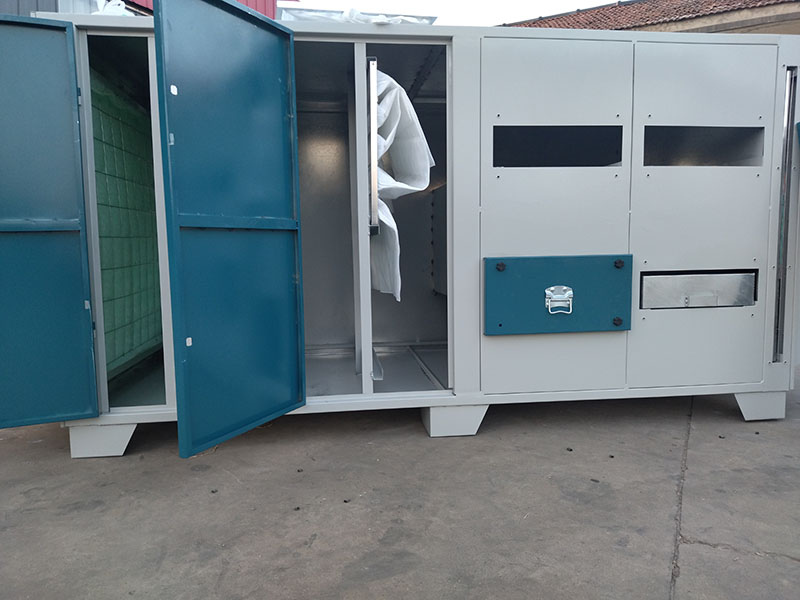 3.1、干式過濾器尺寸:L2.6*W1.1*H1.7(米),進出風口?500或?600配置:1層W型漆霧過濾棉,1層F4袋式過濾器(6個袋子),二次過濾漆霧。活性炭抽屜3個,每個抽屜40塊活性炭磚。