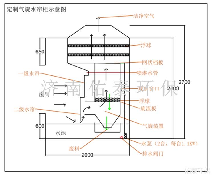 1、氣旋式噴漆水簾柜簡(jiǎn)稱(chēng)氣旋水簾柜,氣旋噴漆柜。該設(shè)備作業(yè)時(shí),粉塵或廢氣在負(fù)壓風(fēng)機(jī)牽引力的作用下,噴漆噴膠產(chǎn)生一部分乳化性廢氣顆粒隨水簾落到水池中,大部分廢料進(jìn)入高速旋流導(dǎo)軌裝置,漆霧、旋風(fēng)與水在高速旋轉(zhuǎn)的進(jìn)行氣液乳化反應(yīng)。氣動(dòng)混流裝置的高速運(yùn)轉(zhuǎn),使得漆霧與旋轉(zhuǎn)液體充分混合,在離心力的作用下達(dá)到漆液分離。氣旋桶內(nèi)部采用水泵循環(huán)給水,由安裝在隔水層底部的螺旋噴嘴噴出來(lái),漆霧分離出來(lái)的粉塵顆粒物下沉到水箱底部,分離后的氣體進(jìn)入環(huán)保填充料隔水層,然后進(jìn)入后段的廢氣處理設(shè)備。
