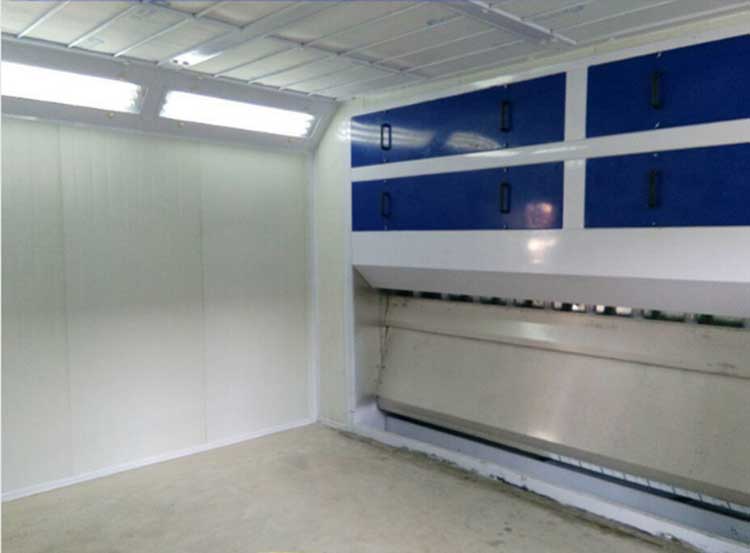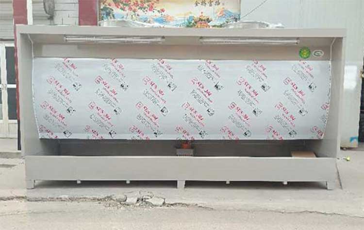 水簾柜工作時,水泵連續向溢流槽供水,使水溢流,在水簾板上形成瀑布狀的水簾。供風機將空氣從室體頂部將新鮮空氣均勻送入,排風機通過水簾與室體形成的通路從水簾下部將操作區的被污染的空氣吸走,從而保證噴室內空氣循環流動。噴漆時,一部分過噴的漆霧碰到水簾板的水簾上,被水沖走至儲水槽內,沒被捕捉的漆霧隨頂部吹下的氣流經過水簾板下部在漆霧洗滌裝置內與水霧充分混合洗滌,氣流內形成的混合漆霧的較大液滴經擋水板阻擋,絕大部分回到儲水槽內,剩余的廢氣再經活性炭吸附箱充分過濾,潔凈的空氣經排氣管路進入大氣。