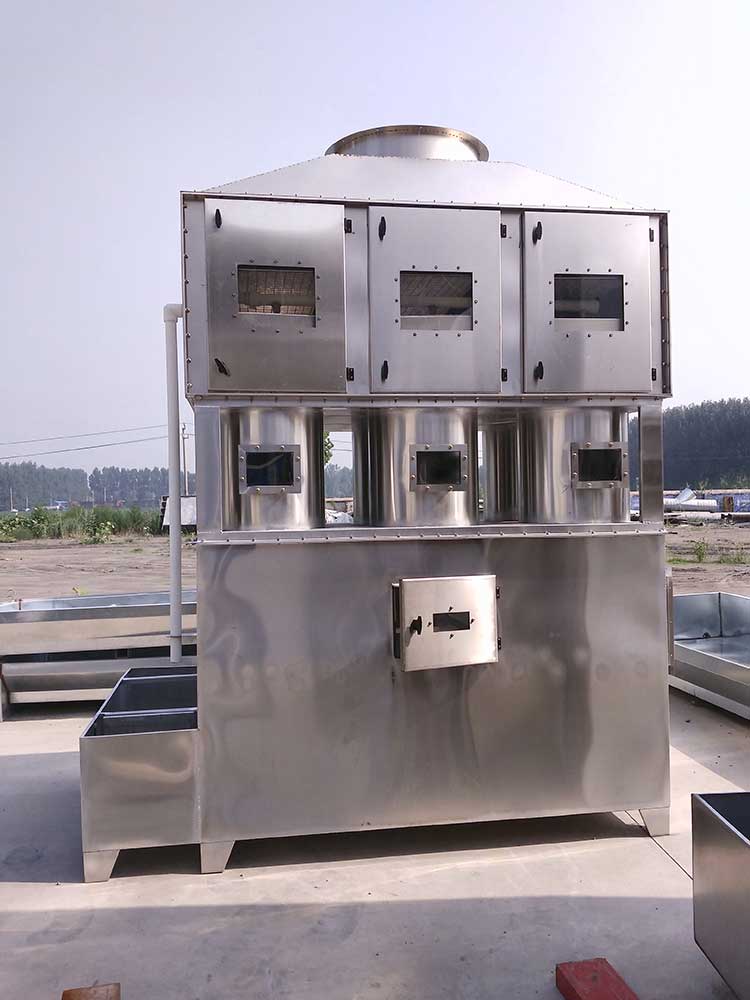 一、旋流脫硫塔工作時含塵廢氣由風管引入旋流塔內,經過旋轉洗滌桶風帶加快,帶動填料球飛帶運轉,在洗滌桶里,含塵廢氣與水霧充分混合洗滌、中和反應(水里面補充有酸堿時),廢氣經過凈化后,再經除霧層脫水除霧后由風機排入大氣或再進入其他凈化設備(光氧催化設備、活性炭吸附箱、催化燃燒裝置等),吸收液在塔底經水泵增壓后在箱頂噴淋霧化而下,回流至箱底循環使用。